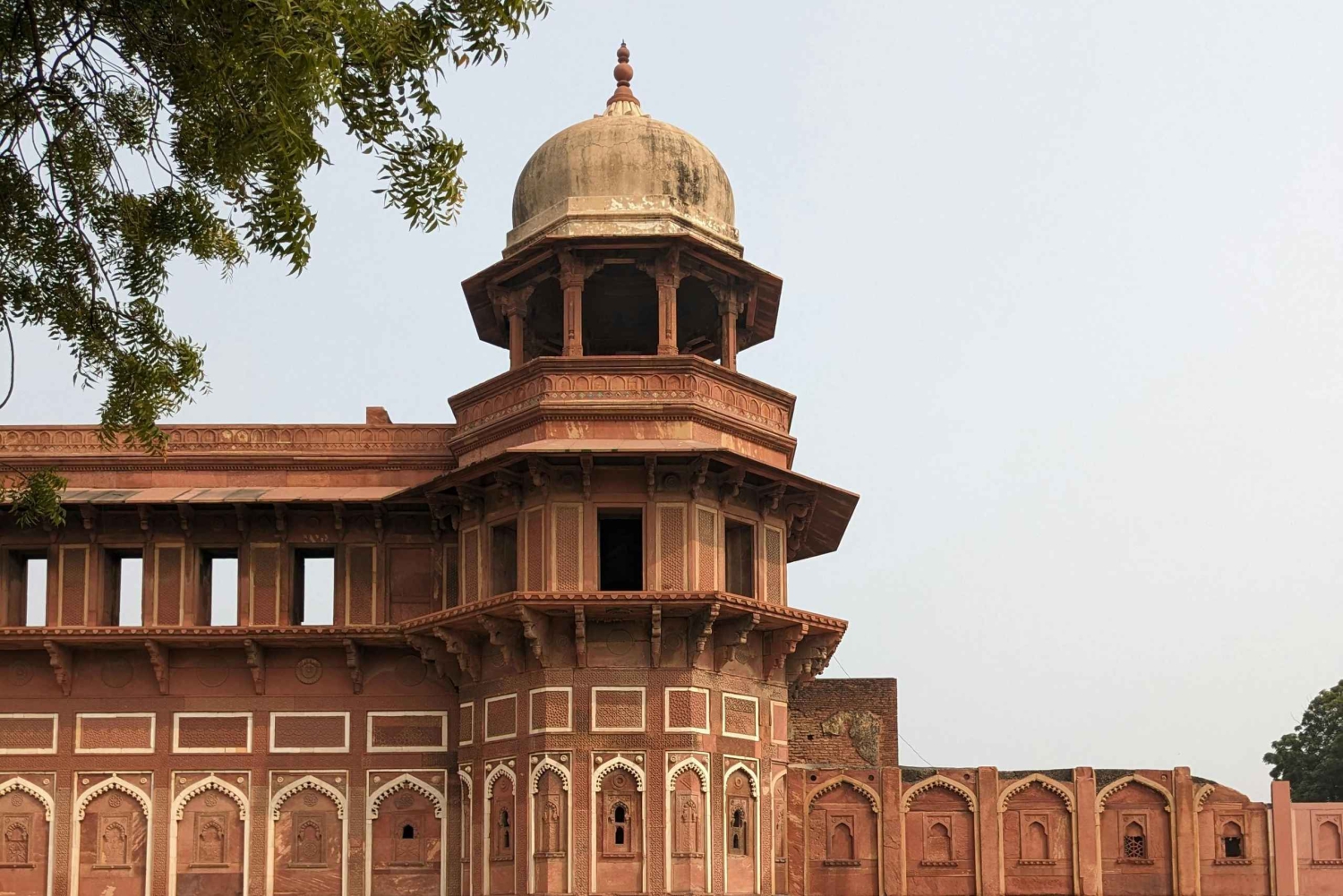 Næste stop: Agra Fort. Den er kæmpe – virkelig imponerende – og blev bygget helt tilbage i det 16. århundrede af kejser Akbar. Du kan slentre gennem dens gårdrum, kigge ind i gamle værelser og buer og se alle mulige arkitektoniske detaljer, der blander forskellige kulturer. Guidens historier gør det endnu bedre og tilføjer små historier, som du helt ville gå glip af på egen hånd.